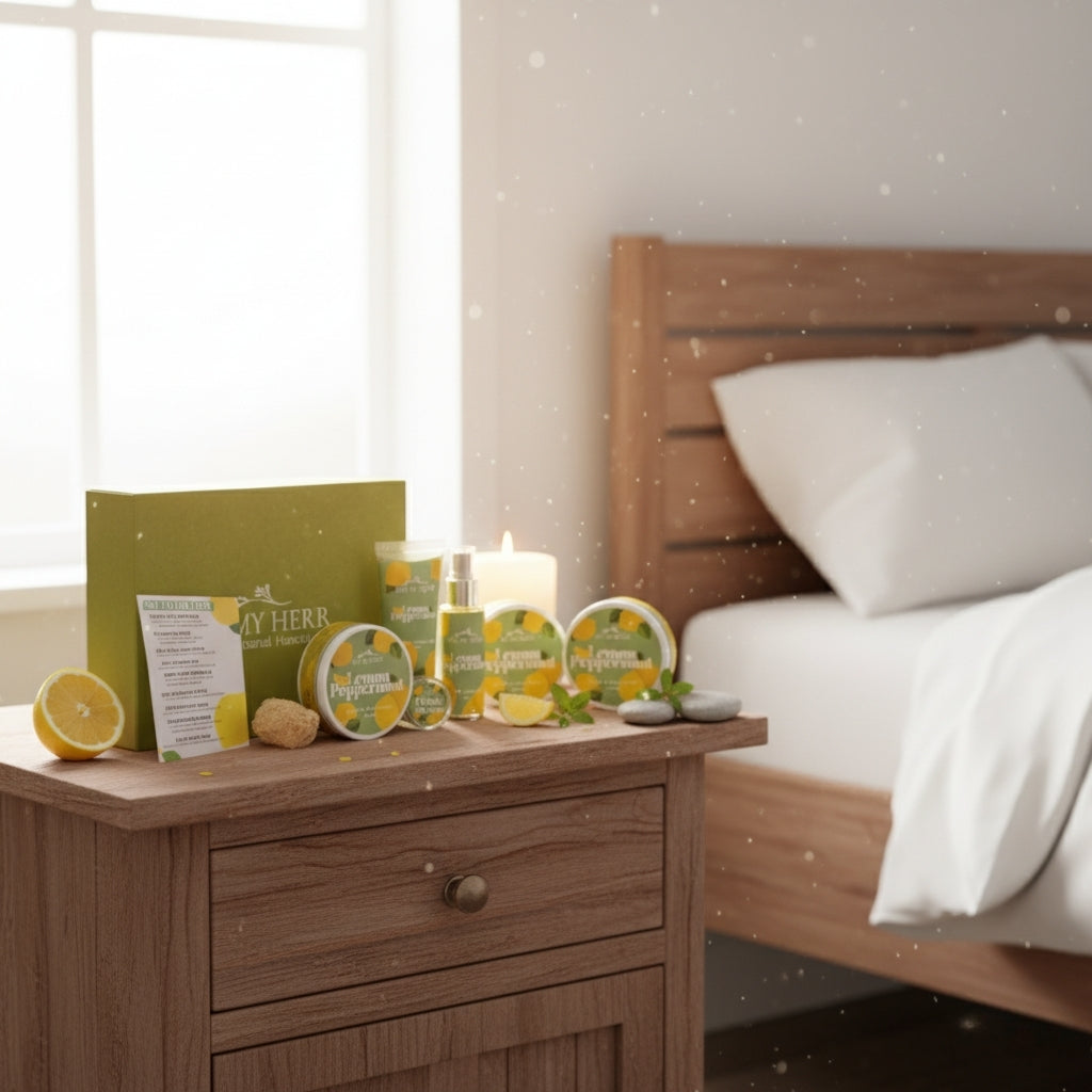 Lemon Peppermint Hand and Foot Soak, Lemon Peppermint Hand and Foot Scrub, Lemon Peppermint Massage Gel, Lemon Peppermint Hand and Foot Mask, Lemon Peppermint Cuticle Softner, Lemon Peppermint Hand and Foot Mist, Loofah Sponge.